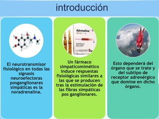 El documento describe los principales aspectos del sistema nervioso simpático y las catecolaminas. Explica que la noradrenalina es el principal neurotransmisor simpático y que los fármacos simpaticomiméticos actúan de forma similar a la estimulación nerviosa. Además, detalla los mecanismos de síntesis, almacenamiento, liberación y recaptación de las catecolaminas, así como la clasificación y mecanismos de acción de los receptores adrenérgicos y las aminas simpaticomiméticas.