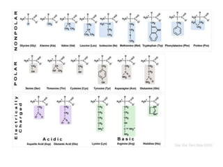 Los aminoácidos son las unidades estructurales de las proteínas. Existen 20 aminoácidos que conforman las proteínas. Cumplen funciones como formar parte de proteínas, vitaminas, hormonas y neurotransmisores. Se clasifican según su estructura química y propiedades como la presencia de grupos polares o carga eléctrica. Forman enlaces peptídicos al unirse el grupo carboxilo de un aminoácido con el grupo amino de otro, liberando una molécula de agua.