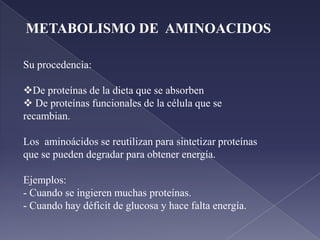 El documento describe los procesos metabólicos relacionados con los compuestos nitrogenados como los aminoácidos. Explica que los aminoácidos se pueden utilizar para sintetizar proteínas o degradarse para obtener energía. La degradación implica la desaminación para eliminar el grupo amino, el cual se transporta principalmente al hígado para convertirse en urea a través del ciclo de la urea. También describe los procesos de fijación de nitrógeno atmosférico, biosíntesis de aminoácidos a partir de am