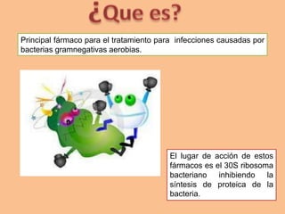 El documento habla sobre los aminoglucósidos, un grupo de antibióticos usados para tratar infecciones bacterianas. Se detalla su mecanismo de acción, espectro, fases de penetración celular, presentaciones y dosis recomendadas para diferentes infecciones. También describe los principales aminoglucósidos (gentamicina, tobramicina, amikacina, etc.), sus indicaciones y efectos adversos como la toxicidad renal y auditiva.