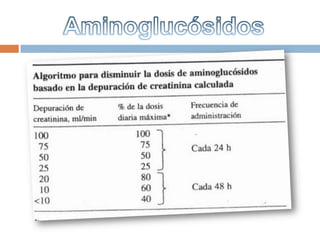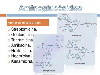 Este documento resume las propiedades de varios aminoglucósidos como la estreptomicina, gentamicina y amikacina. Actúan inhibiendo la síntesis proteica bacteriana. Se usan para tratar infecciones por bacterias gramnegativas y tuberculosis. Su absorción es buena vía intramuscular y se eliminan principalmente por riñón. Pueden causar toxicidad auditiva, vestibular y nefrotóxica.