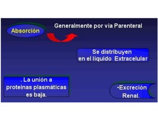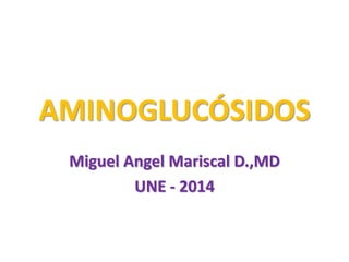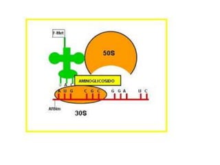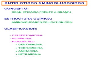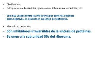 Este documento describe los aminoglucósidos, una clase de antibióticos que incluye la estreptomicina, kanamicina y gentamicina. Actúan inhibiendo la síntesis de proteínas al unirse a la subunidad 30s del ribosoma bacteriano. Son absorbidos lentamente por vía oral pero rápidamente por vía intramuscular. Sus efectos adversos principales son la nefrotoxicidad y ototoxicidad, especialmente con tratamientos prolongados o en pacientes ancianos o con insuficiencia renal. La gentamicina en particular se usa contra infe