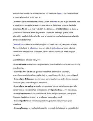 El documento define la amistad como una relación afectiva entre dos o más personas que comparten intereses comunes. A lo largo de la historia, la amistad se ha representado de diversas formas en la mitología griega y romana y a través de símbolos como dos corazones unidos. El documento también describe diferentes tipos de relaciones interpersonales como los asociados, contactos útiles y amigos confidentes.