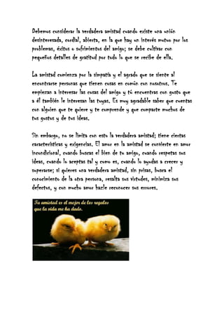 La amistad es como una caja de cristal donde se guardan los pensamientos y sentimientos por el amigo. Un amigo no es solo una persona física, sino algo que se siente en el corazón. La verdadera amistad requiere una unión desinteresada donde hay interés mutuo por los problemas y éxitos del otro, así como cultivar detalles de gratitud.