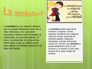 El documento describe la amistad como una relación afectiva que se puede dar entre individuos y se caracteriza por valores como la lealtad y la sinceridad. Explica que la amistad puede surgir entre personas de diferentes edades, géneros, religiones y culturas. Además, detalla cómo la amistad se desarrolla en diferentes etapas de la vida como la infancia, adolescencia, madurez y vejez.