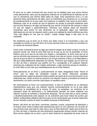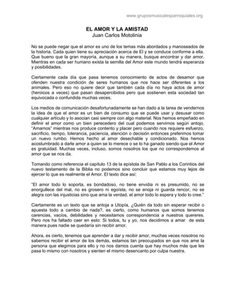 El documento habla sobre el amor y la amistad. Discute que el amor es un tema ampliamente tratado en la historia y que cada persona tiene su propia perspectiva sobre el amor. También menciona que a pesar de los actos de desamor, cada día también hay actos de amor que sostienen a la sociedad. Finalmente, concluye que debemos esforzarnos por amar como dice la Biblia: con paciencia, bondad y sin esperar nada a cambio.