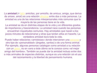 Este documento describe la amistad como una relación afectiva entre dos o más personas basada en el respeto mutuo, la sinceridad, la generosidad y la aceptación. Define las características de una verdadera amistad como no pretender controlar al otro, ser franco, dar de sí mismo de forma espontánea y perdonar los defectos del amigo. También explica que la amistad permite compartir experiencias y apoyarse mutuamente en los momentos felices y difíciles.