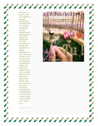 La amistad puede formarse en cualquier etapa de la vida y entre personas de diferentes orígenes, géneros y pasados. Aunque a veces la amistad puede convertirse en amor romántico entre personas del sexo opuesto, también es posible una amistad pura sin atracción física. Un verdadero amigo es alguien en quien se puede confiar y que estará a tu lado sin importar qué.
