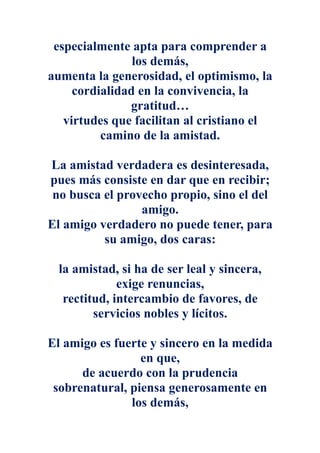 La amistad verdadera requiere dar más que recibir y buscar el bienestar del amigo sobre el propio. Un amigo verdadero es leal, sincero, y está dispuesto a hacer sacrificios. La amistad fomenta virtudes como la generosidad, el desinterés, la solidaridad y permite compartir alegrías y penas.