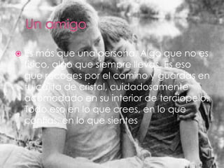 Este documento trata sobre la amistad y el amor. Define la amistad como un cristal frágil donde se guardan los pensamientos y sentimientos más preciados. Un amigo verdadero es alguien que siempre está presente emocionalmente aunque no físicamente. El amor es descrito como la emoción más bella pero difícil de definir, que motiva y da felicidad a través de la entrega y aceptación total.