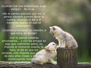 Este documento reflexiona sobre la importancia de la amistad y cómo los amigos verdaderos permanecen en el corazón a lo largo del tiempo, más allá de fechas y detalles específicos. Celebramos aniversarios con nuestras parejas pero con los amigos solo importan los momentos compartidos y el cariño que se ha ido construyendo.