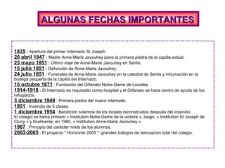El documento proporciona información sobre Anne-Marie Javouhey, quien fundó la congregación San-Jose de Cluny en 1805 para cuidar de niños pobres y estableció un colegio en 1835. El documento luego detalla algunas fechas clave en la historia del colegio Anne-Marie Javouhey en Senlis y proporciona detalles actuales sobre el número de estudiantes, profesores y actividades que se ofrecen.
