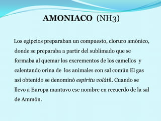El documento describe las propiedades químicas del amoníaco (NH3), incluyendo su fórmula, punto de ebullición, solubilidad y usos principales como fertilizante y en la producción de otros productos químicos. También detalla los riesgos para la salud que representa y las medidas de seguridad necesarias para su manipulación, almacenamiento y transporte.
