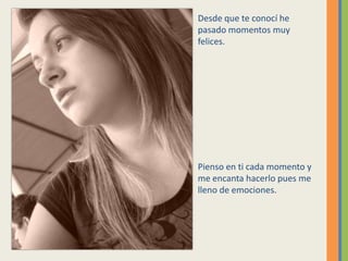 Este documento es una carta de amor en la que el autor expresa sus sentimientos por la persona a la que se dirige, mencionando los momentos felices que han compartido desde que se conocieron y lo mucho que piensa en ella. El autor también expresa su deseo de verla de nuevo, darle besos y lo mejor de sí mismo, y pregunta si le gustaría ser su novia.