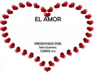 Este documento habla sobre el tema del amor. Define el amor como un puro sentimiento que puede existir entre familiares, amigos y parejas. Incluye un poema de amor de 14 estrofas que expresa sentimientos como la admiración y el deseo por la persona amada. También presenta algunas frases cortas sobre el amor y una canción de amor de Ricardo Arjona. Por último, proporciona 5 breves consejos sobre cultivar el amor de forma inteligente e internalizar que el amor es la mayor joya.
