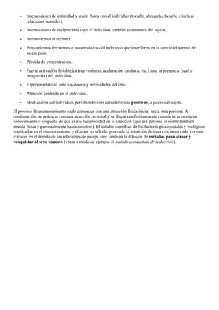 El documento define el amor como un concepto universal que se interpreta de diversas formas según la ideología y perspectiva. Explica que el amor puede verse como un sentimiento de afecto, una virtud que representa la bondad humana, o acciones basadas en la compasión o el afecto. También describe el enamoramiento como un estado emocional caracterizado por la alegría y atracción intensa hacia otra persona, que se origina en procesos cerebrales y cambios químicos. Finalmente, señala que tanto el amor como el enamoramiento se han