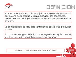 El amor es un sentimiento complejo que involucra tanto emociones como racionalidad, siendo resultado de la observación de propiedades agradables en otros. Se manifiesta en diversas formas, tales como el amor fraternal, maternal y romántico, y se basa en la necesidad humana de conexión y aceptación. Además, la expresión del amor se ve influenciada por aspectos fisiológicos y se puede evidenciar a través de gestos sencillos y momentos significativos.