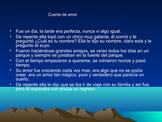 Dos jóvenes se enamoran en el parque y su amor crece con el tiempo. La chica debe irse de viaje pero su familia sufre un accidente fatal. El chico, devastado por la muerte de su amada, va al parque y siente su presencia, prometiéndole que siempre la amará a pesar de la muerte.