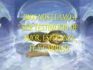 Este documento habla sobre el amor a Dios y cómo debemos demostrar ese amor a través de nuestra fe, esperanza, caridad y servicio a los demás. Nos llama a ver a Dios en los rostros de los pobres y a ser mensajeros de paz, perdón y amor en el mundo. También dice que debemos buscar a Dios en nuestro interior y que para aquellos que creen y aman a Dios, ningún esfuerzo es demasiado grande.