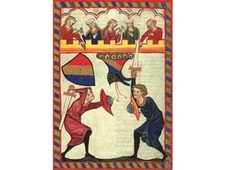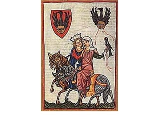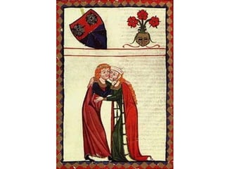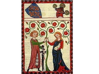 El documento describe el concepto del amor cortés en la literatura medieval francesa de los siglos XI y XII. El amor cortés era imaginario e idealizado, que se practicaba entre la nobleza en la corte real siguiendo normas estrictas de comportamiento ritualista y secreto a pesar de a menudo ser adúltero.