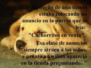 Un niño vio un anuncio de cachorros en venta en una tienda. Preguntó el precio y solo tenía 5 euros, así que pidió verlos. Un cachorro cojeaba, y el niño quiso comprarlo a pesar de que el dueño dijo que siempre cojearía. El niño mostró que él también cojeaba y entendía al cachorro, por lo que pagaría los 40-50 euros completos aunque le llevara tiempo. El dueño se conmovió por la compasión del niño.