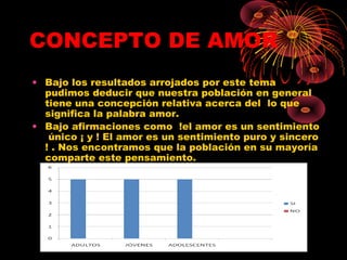 El documento resume los resultados de una encuesta sobre el amor y el sexo en diferentes grupos de edad. La mayoría de la población considera que el amor es un sentimiento único y puro. Reconocen los cambios de comportamiento en una persona enamorada. Sin embargo, rechazan la idea de que el amor depende solo de las relaciones sexuales o termina con el sexo. La población carece de un concepto sólido de la palabra "sexo" y los adolescentes tienden a verlo como un medio de complacerse. Todos reconocen los riesgos