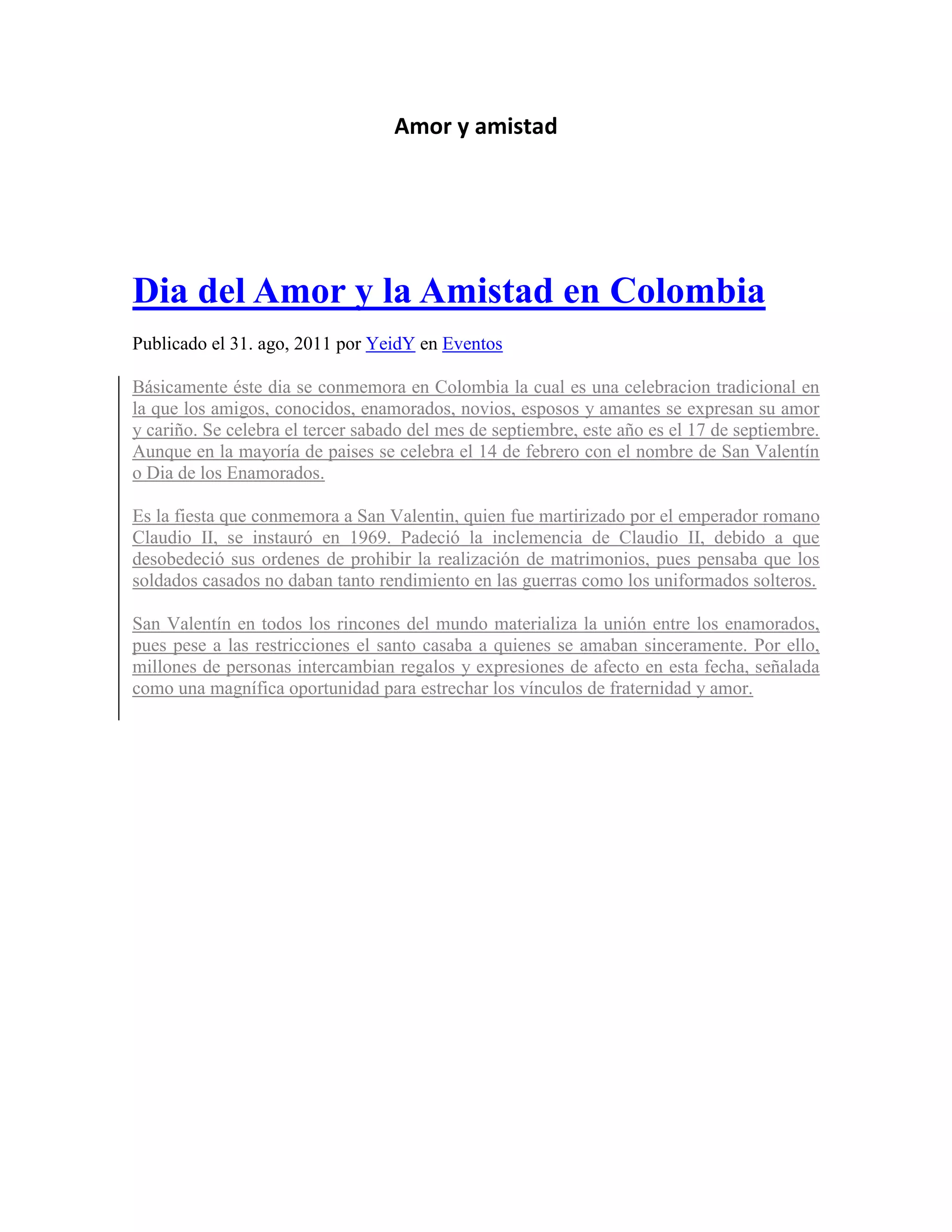 En Colombia, el Día del Amor y la Amistad se celebra el tercer sábado de septiembre en lugar del 14 de febrero como en otros países. Esta fecha conmemora la amistad y el amor entre parejas, amigos y familiares, y es común intercambiar regalos y cartas de afecto. Se suele jugar al "amigo secreto" y dar pequeños obsequios de manera anónima hasta el día central de la festividad.