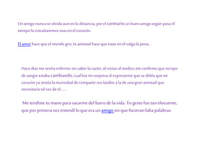 El documento habla sobre la amistad y el amor. Un buen amigo se extrañará más con el tiempo a pesar de la distancia. El amor hace que el mundo gire y la amistad hace que valga la pena vivir en él. Una gran amistad puede hacer que el corazón sienta la necesidad de compartir sus latidos. El amor da fuerza para enfrentar los obstáculos de la vida. El amor puede eliminar el sentido del tiempo y anular el temor al final.