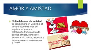 El documento habla sobre el Día del Amor y la Amistad en Colombia, el cual se celebra el tercer sábado de septiembre. Explica que en esta fecha los amigos, parejas y amantes expresan su cariño. También incluye algunas frases sobre el amor y la amistad. Por último, resume brevemente la historia de esta celebración y cómo se originó a partir de la figura de San Valentín en la época del Imperio Romano.