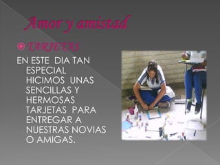 El documento describe las actividades realizadas en una escuela para celebrar el Día de San Valentín, incluyendo hacer tarjetas para novias y amigas, comer empanadas, izar la bandera con compañeros elegidos por su buena amistad, y cantar canciones compartidas por dos estudiantes.