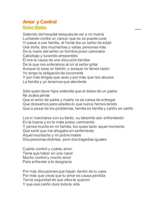 Un padre lleva a su familia al hospital para ver a la madre enferma de cáncer. En el camino se encuentran con un hijo problemático que ha causado una discusión familiar. A pesar de los problemas, el padre le recuerda a la familia que deben cuidarlo porque la familia es para siempre y el amor de los padres nunca termina. El poema reflexiona sobre la necesidad de mantener tanto el amor como el control en la familia para enfrentar los problemas y desgracias de la vida.