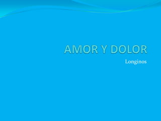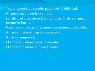 Este documento habla sobre el amor y el dolor. Explica que el amor verdadero es desinteresado, incondicional y una decisión, no un sentimiento pasajero. También menciona que el amor egoísta causa dolor a quien lo da y recibe, ya que manipula y somete. Además, señala que el dolor es parte de la vida humana y que cuando se ofrece a Dios, puede llevarnos a la reflexión, humildad y purificación. Finalmente, cita a San Juan de la Cruz diciendo que no hay