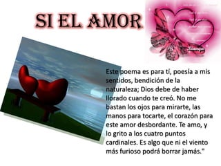 Este documento contiene cinco poemas cortos sobre el amor y la amistad. El primer poema expresa el regalo eterno de la amistad. El segundo describe el amor como una bendición de la naturaleza. El tercero habla de un viaje compartido en el que se ven paraísos y sombras. El cuarto expresa el dolor de no ser amado en retorno. Y el quinto resalta que la oración y la amistad con Cristo aumentan la capacidad de ser amigos.