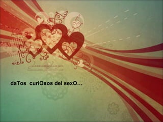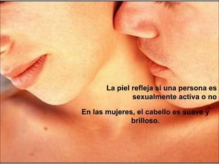 El documento presenta algunos datos curiosos sobre el sexo. Menciona que la piel puede reflejar la actividad sexual de una persona y que el cabello de las mujeres se vuelve más suave y brillante. También indica que tener relaciones sexuales puede ayudar a reducir espinillas, dermatitis y acné, además de combatir dolores de cabeza, asma y alergias. Finalmente, señala que el sexo libera endorfinas que crean una sensación de bienestar y que entre más actividad sexual se tenga, mayores son las probabilidades de tener más en el