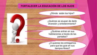 El documento habla sobre la importancia de fortalecer la educación de los hijos. Los padres deben pasar tiempo de calidad con sus hijos, orientarlos y prevenirlos de posibles riesgos. También deben generar confianza en los hijos a través del afecto y el buen ejemplo. La familia es la primera escuela de valores y los padres deben educar a los hijos en la fe y valores éticos de manera paciente.