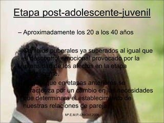 Este documento describe el amor en la etapa juvenil-adulta. Explica que en esta etapa, las personas se centran en encontrar una pareja para compartir la vida y formar expectativas comunes. Aunque puede haber un flechazo inicial, el enamoramiento es más sereno que en la adolescencia. Describe los componentes del enamoramiento como la intimidad, la pasión y el compromiso, según la teoría triangular del amor de Sternberg.