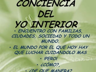 El documento aborda el amor como la esencia del ser humano, enfatizando la importancia de la entrega y el esfuerzo en la vida. También destaca la necesidad de cuidar el mundo y la responsabilidad individual para enfrentar problemas sociales como la violencia y la corrupción. Se insta a las personas a reconocer su identidad y actuar con acción positiva para generar un cambio.