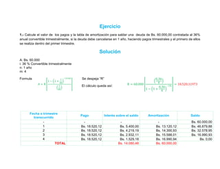 El documento presenta las soluciones a dos ejercicios de cálculo de intereses y amortización de deudas. El primer ejercicio calcula los pagos y la tabla de amortización para saldar una deuda de Bs. 60.000 a un interés del 36% anual pagadero en cuotas trimestrales durante un año. El segundo ejercicio calcula los pagos para saldar una deuda de Bs. 40.000 a un interés del 15% capitalizable mensualmente en 6 pagos mensuales. Ambos ejercicios utilizan fórmulas