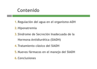 Este documento describe el síndrome de secreción inadecuada de la hormona antidiurética (SIADH). Explica que el SIADH se caracteriza por una secreción excesiva de la hormona antidiurética que causa retención de agua y consecuente hiponatremia. Detalla las causas más comunes del SIADH como enfermedades pulmonares e infecciones, así como los síntomas de la hiponatremia y los tratamientos convencionales como la restricción de líquidos y la corrección con suero salino.