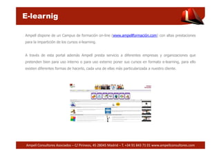 Ampell Consultores Asociados ofrece una plataforma de formación online adaptada a las necesidades de empresas y organizaciones, permitiendo personalizar cursos e-learning según los requerimientos del cliente. La metodología se centra en la interacción y aplicación práctica del conocimiento, facilitando la adaptación continua a los cambios del entorno empresarial. Ampell tiene presencia internacional y colabora con diversas instituciones, garantizando calidad y cumplimiento normativo en sus servicios de consultoría y formación.