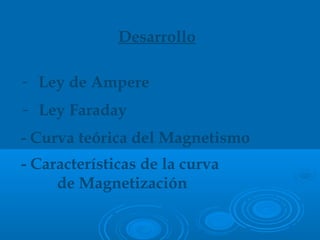 Este documento describe las leyes de Ampere y Faraday sobre electromagnetismo y magnetismo. Explica la curva de magnetización de los materiales ferromagnéticos y cómo se relaciona la intensidad de corriente eléctrica con el campo magnético producido según la ley de Ampere. También resume el descubrimiento de la inducción electromagnética por parte de Faraday y cómo varía el potencial eléctrico inducido en una espira con los cambios en el flujo magnético a través de ella.