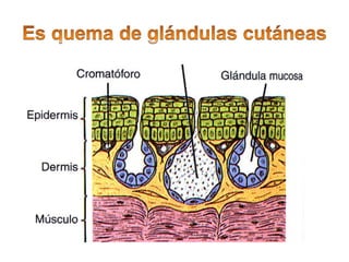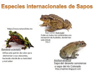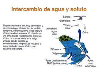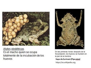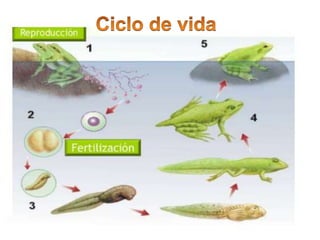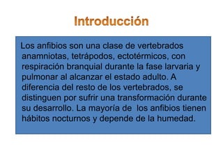 El documento habla sobre los anfibios. Explica que son vertebrados que sufren una transformación durante su desarrollo, pasando de una fase larvaria acuática con branquias a un estado adulto terrestre con pulmones. Describe las características de los principales órdenes de anfibios como los anuros, urodelos y apodos, así como aspectos de su anatomía, fisiología, reproducción y cuidado en cautiverio.