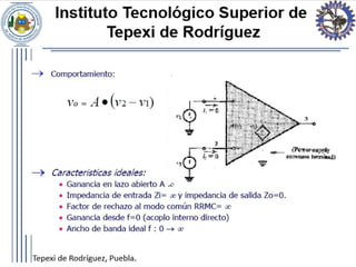 Este documento describe las características de un amplificador ideal y los problemas que presentan los amplificadores operacionales reales. Explica que un amplificador ideal tendría una entrada y salida y amplificaría la señal de entrada sin introducir ningún error, mientras que los amplificadores reales presentan problemas como voltaje de desbalance en la salida aunque no haya señal de entrada, debido a desbalances internos. También habla sobre cómo corregir este efecto mediante el ajuste de un voltaje aplicado entre las terminales de entrada.