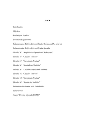 Este documento presenta dos circuitos que utilizan amplificadores operacionales: un amplificador no inversor y un amplificador sumador. Incluye la fundamentación teórica, cálculos, implementación práctica y simulación de cada circuito. Los resultados experimentales concuerdan con los cálculos teóricos, demostrando el funcionamiento correcto de los amplificadores operacionales.