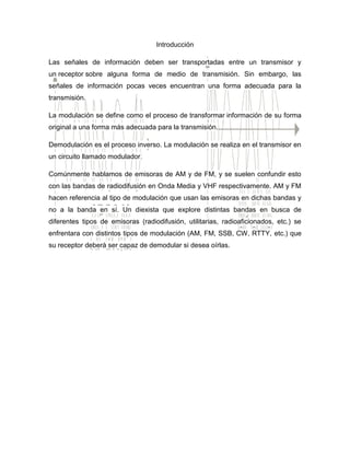 Este documento trata sobre los conceptos básicos de la modulación y demodulación de señales. Explica los procesos de modulación en amplitud de doble banda lateral con y sin portadora, así como la modulación de banda lateral única. Describe los diagramas de bloques de transmisores de baja y alta potencia, e indica las aplicaciones de cada tipo de modulación.