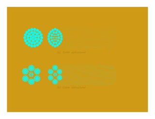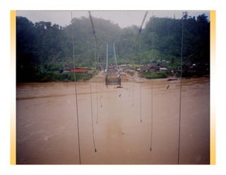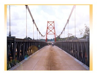 Este documento presenta aspectos estructurales relacionados al montaje de puentes colgantes. Explica la configuración típica de un puente colgante, la tecnología de cables de acero utilizados, incluyendo propiedades mecánicas y protección contra la corrosión. También describe el procedimiento constructivo, con énfasis en el análisis estático de los cables durante el lanzamiento de la superestructura del puente Nieva en Perú.