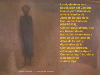 El Cacique Guaicaipuro Cuatemoc expone ante los jefes de estado de la Unión Europea que los pueblos americanos prestaron oro y plata a Europa luego del encuentro, por lo que ahora Europa les debe una deuda histórica enorme por el capital e intereses acumulados. Calcula que la deuda asciende a una cantidad tan grande que supera el peso de la Tierra, por lo que exige a Europa pagarla mediante la privatización o entrega del continente.