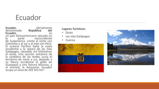 El documento presenta información sobre cinco países de América: Ecuador, Colombia, Argentina, Chile y Brasil. Para cada país, se proporciona su ubicación geográfica, datos sobre su superficie y algunos de sus principales lugares turísticos.