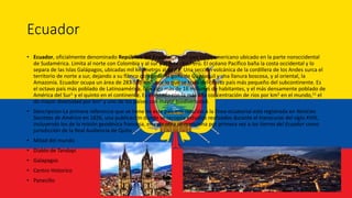 Ecuador es un país sudamericano ubicado entre Colombia y Perú, con costa en el océano Pacífico. Limita al norte con Colombia y al sur y este con Perú. La cordillera de los Andes atraviesa el país de norte a sur. Ecuador tiene una población de más de 16 millones de habitantes y es el país con mayor densidad poblacional en América del Sur. Algunos lugares importantes son la línea ecuatorial, las Islas Galápagos y la ciudad histórica de Quito.