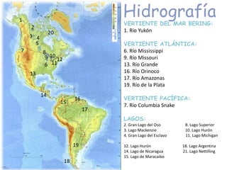 El documento proporciona información sobre la geografía de América. Se describe a América como el segundo continente más grande del mundo, separado de otros continentes y rodeado por tres océanos. Está dividido en América del Norte y del Sur, unidas por América Central. Se destacan las principales cadenas montañosas, cuencas hidrográficas, ríos y lagos de cada región.